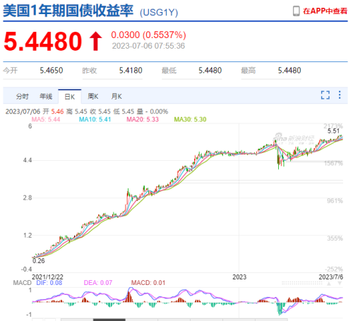 再下面這個圖是美國發行的1年期國債的收益率:如果你現在在市場上購買壹張價值100元的美國國債,那麼收益率可以達到5.4%,高於美聯儲的基准利率(目前美聯儲的基准利率為5.0%,也就是定存壹年的利息是5%)。