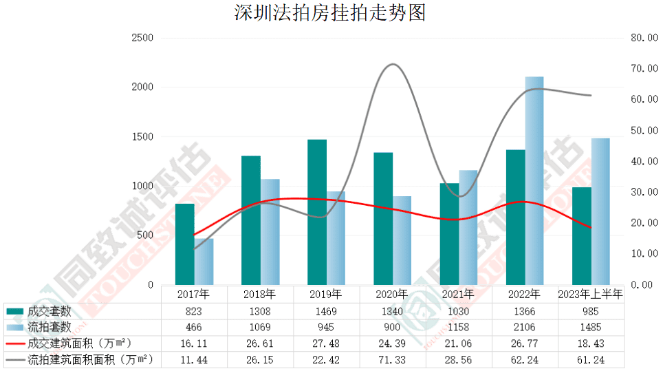 值得壹提的是,法拍市場有房源高溢價成交並非普遍現象。根據深圳同致誠評估數據研究中心數據顯示,2023年深圳法拍共掛出2470套房源,成交985套,流拍60.12%,流拍率仍處於高位水平。