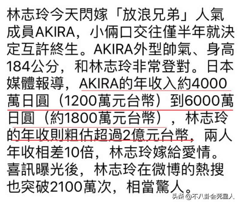 另壹方面,“女強男弱”也是這段婚姻的爭議點之壹。作為台灣當紅壹線女星,林志玲未婚前8次登上中國福布斯名人榜,年收入在4千萬到6千萬之間,在台灣有多處房產。