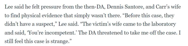 李昌鈺說,他感到來自當時的檢察官丹尼斯·桑托爾和死者卡爾妻子的壓力,要求他找到根本不存在的物證。“在這起案件之前,他們沒有嫌疑人,“受害者的妻子來到實驗室說,‘你無能。’ 地方檢察官威脅要讓我退出此案。我還是覺得這個案子很奇怪。”