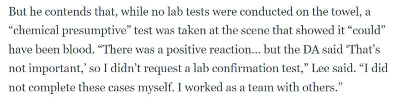 但他聲稱,雖然沒有對毛巾進行實驗室測試,但在現場進行的“化學推定”測試顯示,它“可能”是血液。“出現了陽性反應……但檢察官說‘這並不重要’,所以我沒有要求進行實驗室確認測試,”李昌鈺說,“這些案件不是我自己完成的。我和其他人壹起工作。”