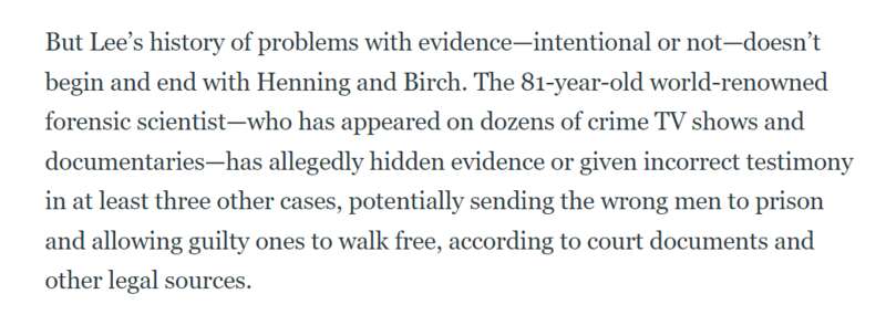 其實,這不是李昌鈺第壹次陷入證據爭議的案件中,《thedailybeast》報道指出,李昌鈺至少在其他叁起案件中隱藏了證據或提供了錯誤的證詞,有可能將無辜的人送進監獄,讓有罪的人逍遙法外。