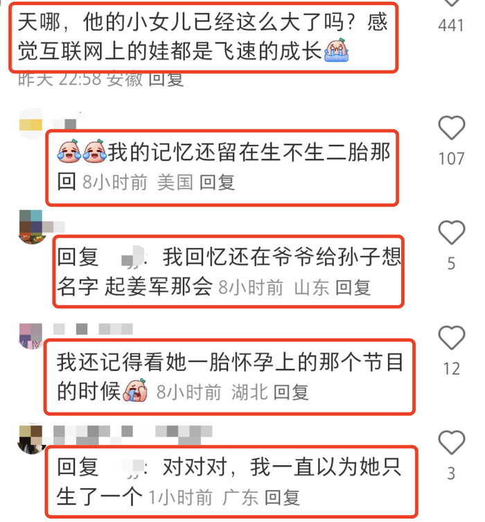 网友纷纷感慨女儿都这么大了,不少人还停留在麦迪娜怀一胎时的画面,姜潮的父亲曾经还想给孙子起名叫“姜军”,一眨眼的功夫,二胎都2岁了。