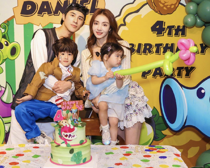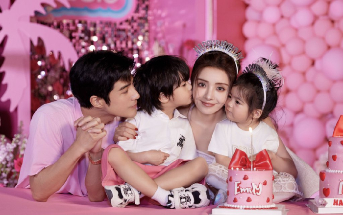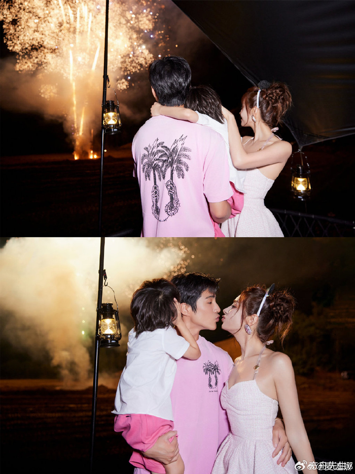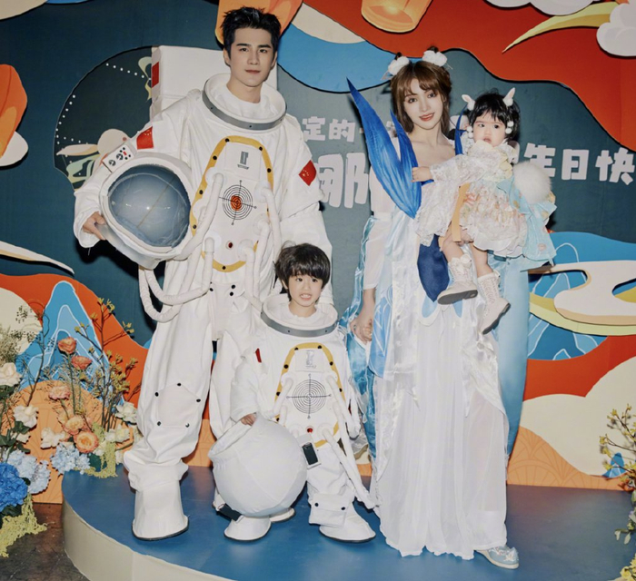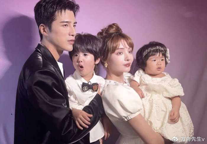 夫妻俩在背景墙上拍了不少恩爱合影,二人接吻的时候,儿子也在跟前有样学样,亲吻妹妹的小脑袋,霸总范儿十足。
