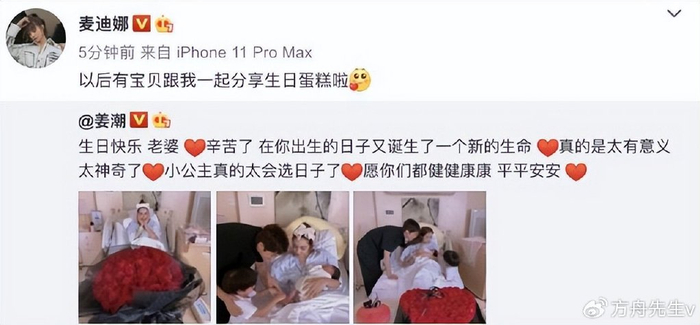 2021年9月10日,麦迪娜生日当天,官宣二胎产女,姜潮又买玫瑰花,又买蛋糕,庆祝这个特别的日子。