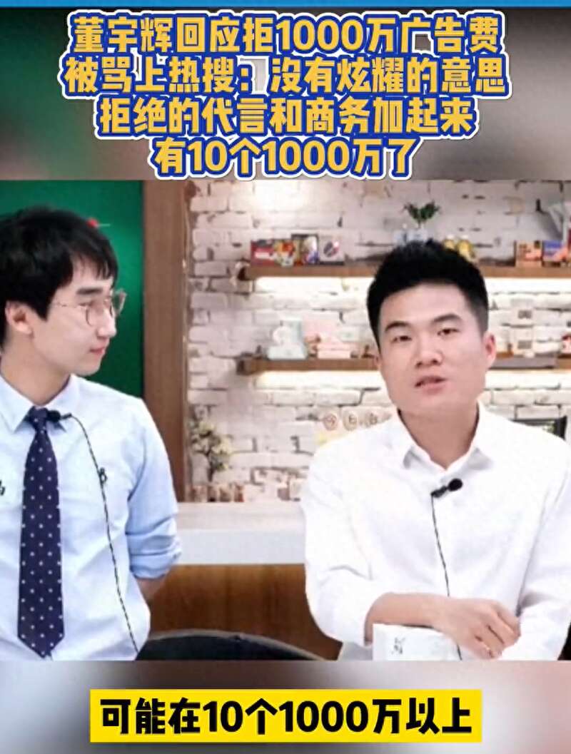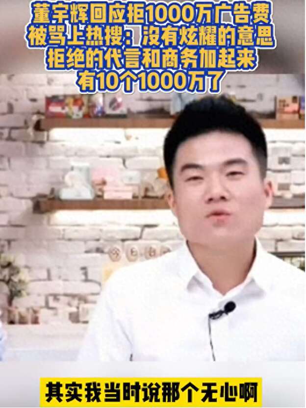 4月20日,董宇輝在東方甄選直播間中回應稱:“我當時是無心說的,沒有向大家炫耀的意思。其實從去年到今年,我拒絕的代言或者商務可能加起來有10個1000萬以上。關於這些為什麼我沒有接受,我覺得不能拿太多,容易錢掙的太多就不想吃苦了。”