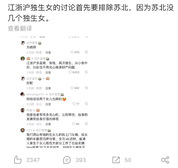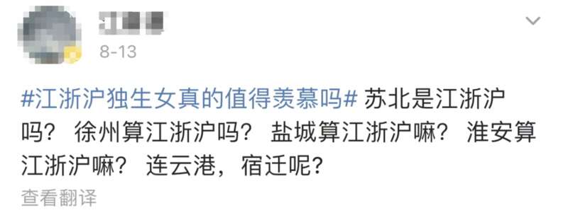 例如,當江浙滬獨生女的概念走紅,蘇北網友第壹時間跳出來撇清關系——那種受盡寵愛,出生就財富自由,家庭美滿的生活,跟咱們沒啥關系,畢竟“蘇北就沒幾個獨生女”。