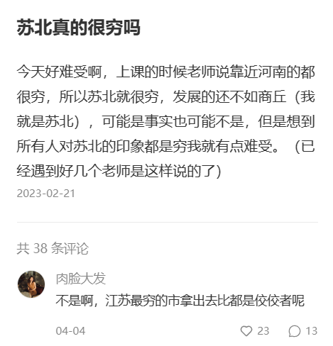 有蘇北網友在外求學時,就被老師壹通暴言嚇到了,“靠近河南的都很窮,所以蘇北就很窮”,以至於“發展得還不如商丘”。