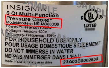 根据加拿大卫生部发布召回通知,Best Buy销售这款受影响的高压锅的烹饪容量为 6 夸脱或 8 夸脱,工作电压为 120V。品牌名称 Insignia 出现在每个高压锅的正面及其永久产品标签上。