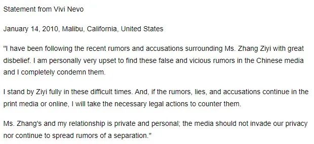 2010年,章子怡将《购物导报》告上法庭,起诉该媒体侵犯名誉权,一直处在“分手疑云”里的Vivi发文力挺,也澄清俩人并没有分手:
