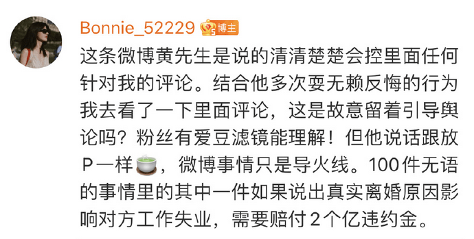 還在評論區再度回懟粉絲,說如果爆料真實的離婚原因,導致對方失業,需要賠付兩個億的違約金,暗示兩人離婚還有別的內幕,沒那麼簡單。