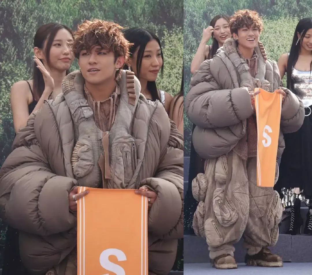比如男歌手AnsonBean的一身巨石羽绒服造型被网友形容为“发瘟装”。