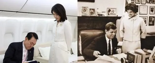 比如与总统的办公室合影,从场景、穿搭、姿势和拍摄角度几乎还原了杰奎琳·肯尼迪的一张经典老照片。