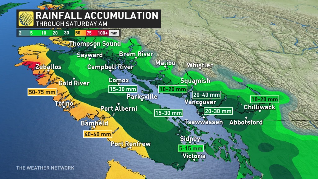 溫哥華島和南海岸所經歷幾波雨雪中的第壹波潮濕氣流已經於周肆進入BC省南部海岸。