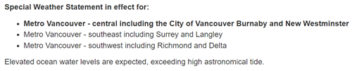 加拿大環境部今天向大溫地區發出了漲潮的特別天氣聲明,影響的地點除了大溫以外,還有南部海灣群島,薩尼奇半島。