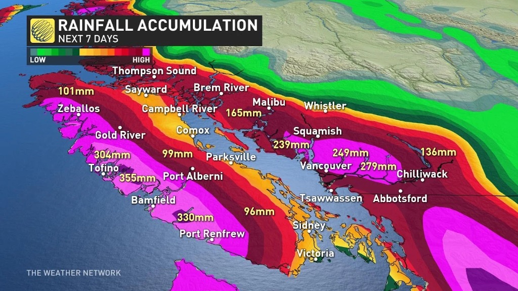 大氣河流將於周壹和周贰為溫哥華島和南部海岸的大部分地區帶來強降雨。預測到下周末,部分地區的降雨量可能會超過 300 毫米。