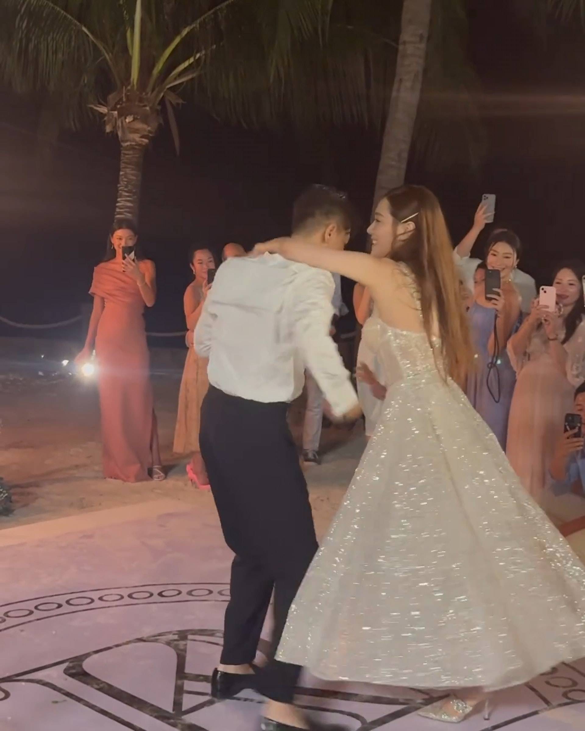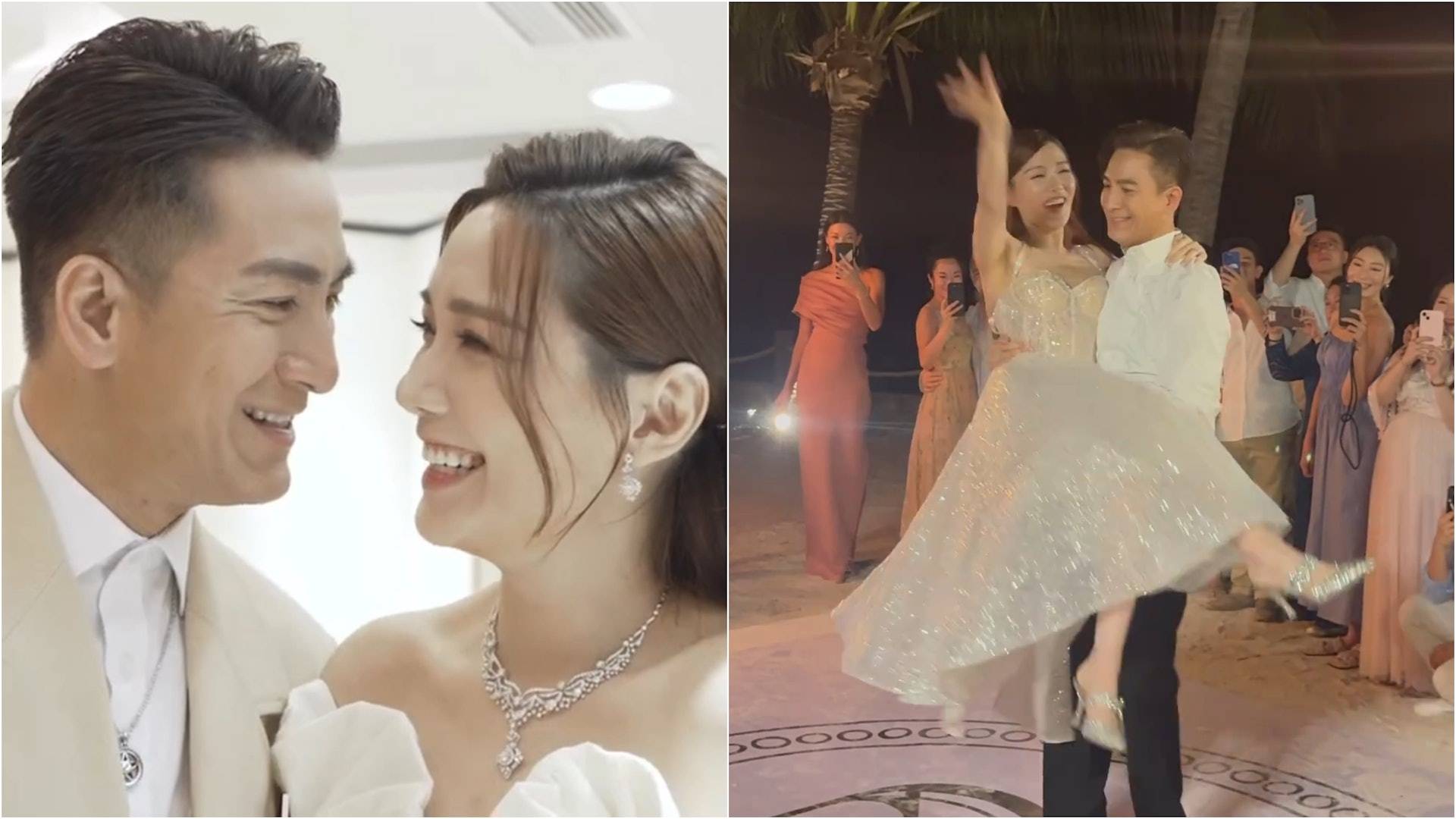 两人在宾客面前跳舞,马国明将老婆抱起来转圈圈,展示他的“老公力”。