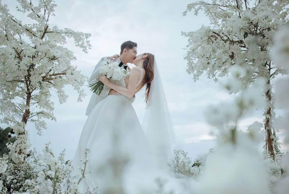 马国明与汤洛雯在户外婚礼上交换戒指,并甜蜜亲吻,接受在场亲友的祝福。