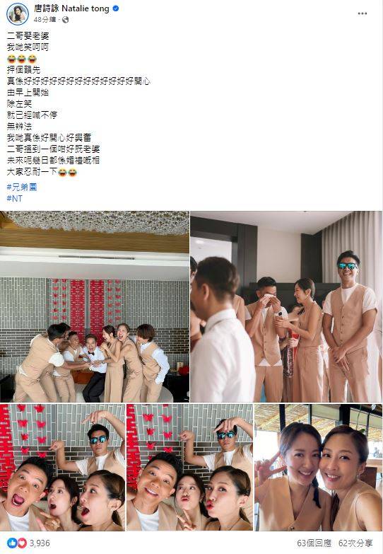 唐诗咏表示,看到“二哥”娶老婆,大家都笑不停,“没有办法,见到二哥找到那么好的老婆,我们很开心很兴奋,未来几天,我都会发婚礼照片,大家忍耐一下……”