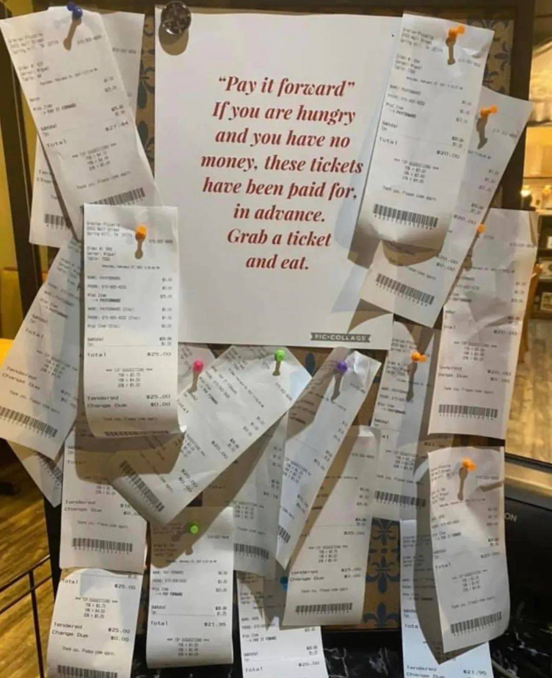 标识牌上写着:“让爱传出去”,如果你饿了又没钱,这些餐票都已经付过钱了,快取走一张去大快朵颐吧。
