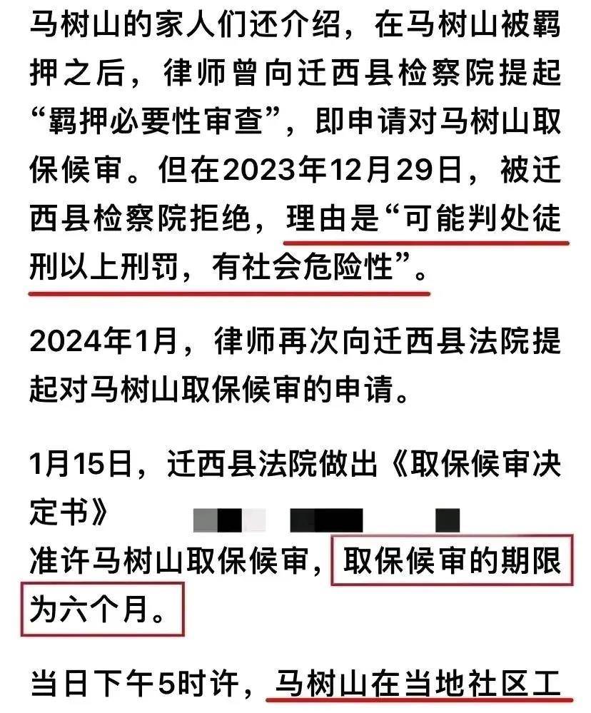 就在1月15日,被拘留了数日的马树山,获得取保候审的资格,已经从拘留所回到了家里。
