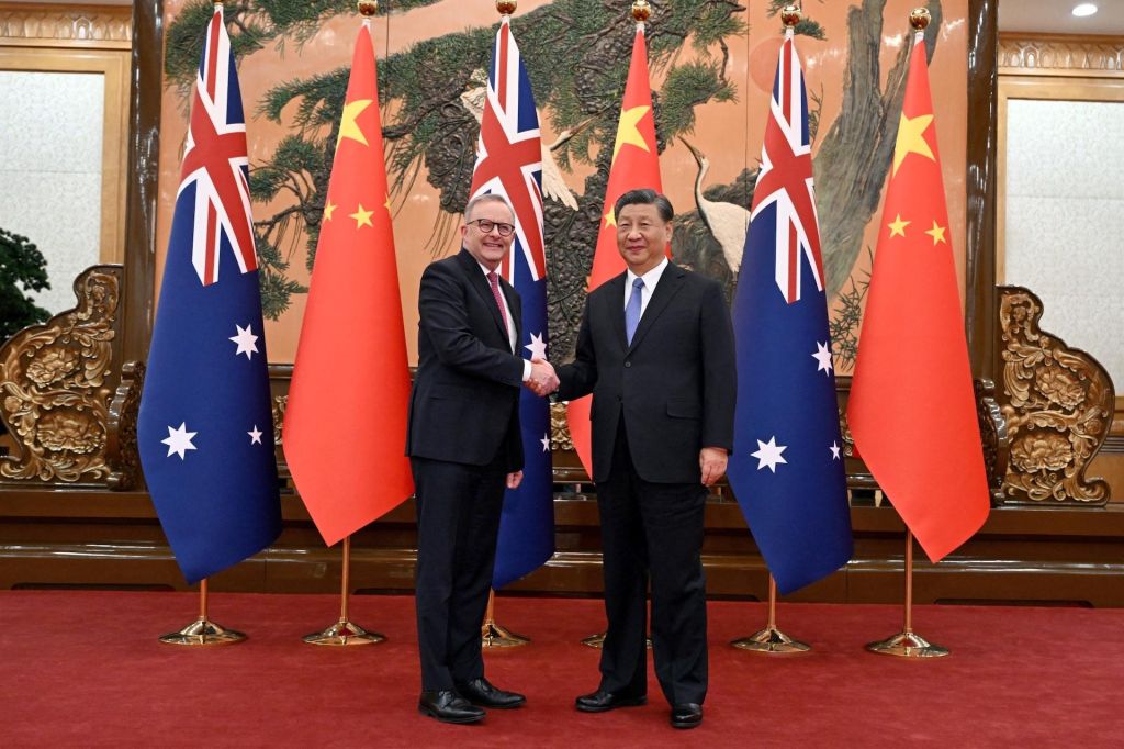 中澳關系:澳洲總理阿爾巴尼斯(Anthony Albanese,左)訪華,與中國國家主席習近平會面。圖為兩人2023年11月6日在中國北京人民大會堂握手合照。(AAP Image/Lukas Coch via REUTERS)