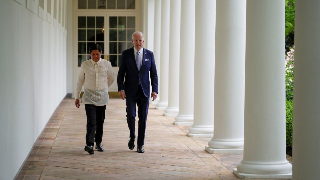 小馬可斯與拜登・美菲關系:美國總統拜登(右)與菲律賓總統小馬可斯(左)2023年5月1日在白宮會面。圖為兩人出席歡迎儀式後,走過白宮西柱廊(West Colonnade)前往橢圓形辦公室。(Reuters)