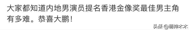 大鵬此前就憑借該片斬獲金爵獎最佳男主角,此次又入圍金像獎最佳男主角,可謂是壹飛沖天!對於這壹次的入圍,不光大鵬開心激動,網友紛紛上線祝福,直言大鵬終於“起勢”了。畢竟在這之前,大鵬經歷過事業至暗時刻,例如讓他獲得熱度的多部作品都被指抄襲,以及他與大張偉的之間是是非非,還有他在主持某檔節目時的失控表現,這些大小風波都曾讓他遭受質疑和指責。