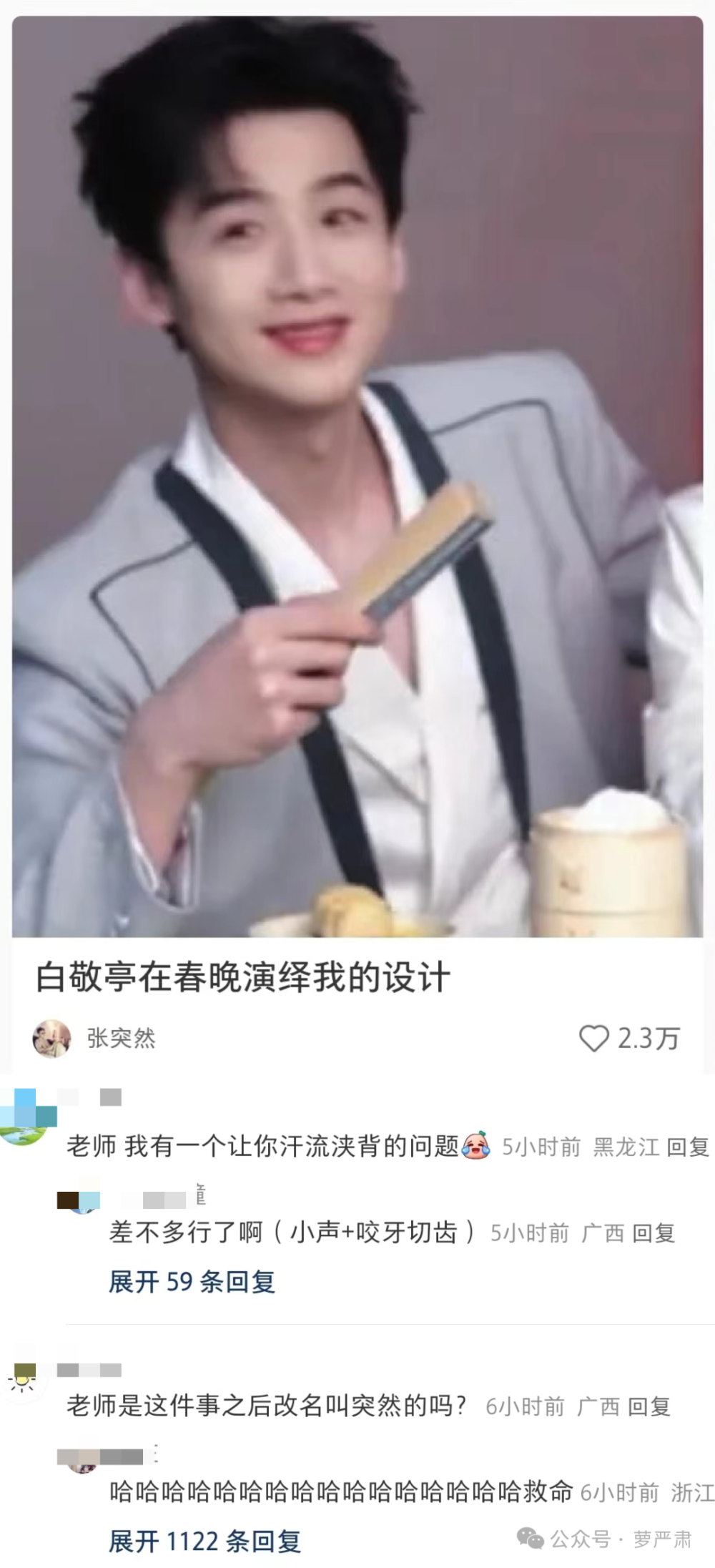 小红书有一位设计师“张突然”说白敬亭上春晚穿了自己做的衣服。评论:“老师是这件事之后改名叫突然的吗?”