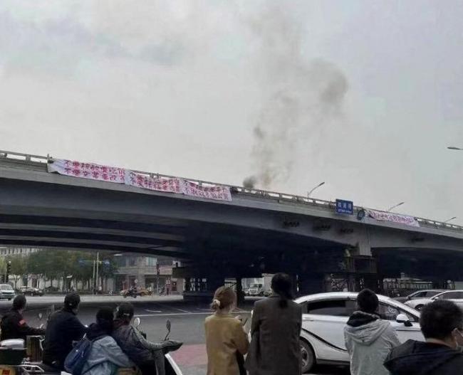 2022年秋,一名抗议者在北京的一座桥上展开横幅,呼吁罢免习近平。图片来源:SOCIAL MEDIA/VIA REUTERS