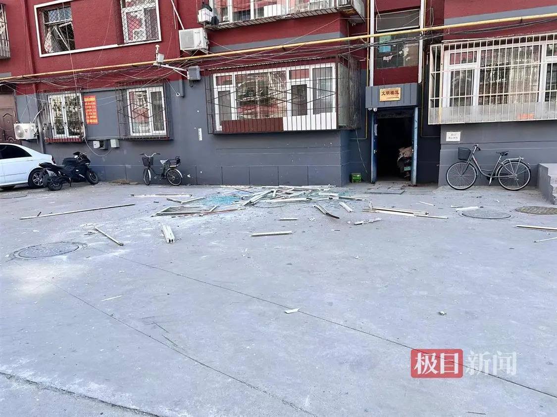 小張各莊居民小區住宅1號樓在爆燃中受損,窗戶、玻璃碎片散落壹地