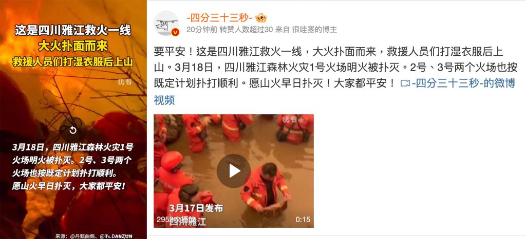 与此同时,中国微博开始出现官方“正能量”宣传的视频和报道。一部标题为《四川雅江救火一线》的视频可见,几名消防人员在溪流里打水。文字写着:大火扑面而来,救援人员们打湿衣服后上山。3月18日,四川雅江森林火灾1号火场明火被扑灭。2号、3号两个火场也按既定计划扑打顺利。另一支视频的相关文字介绍写着:3月18日,大理森林消防从临沧火场直接转战当地,乡亲送上自家土鸡蛋让路上吃。