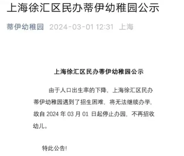 徐汇区的民办蒂伊幼稚园就因招生困难,面向社会发出停止办园公示。