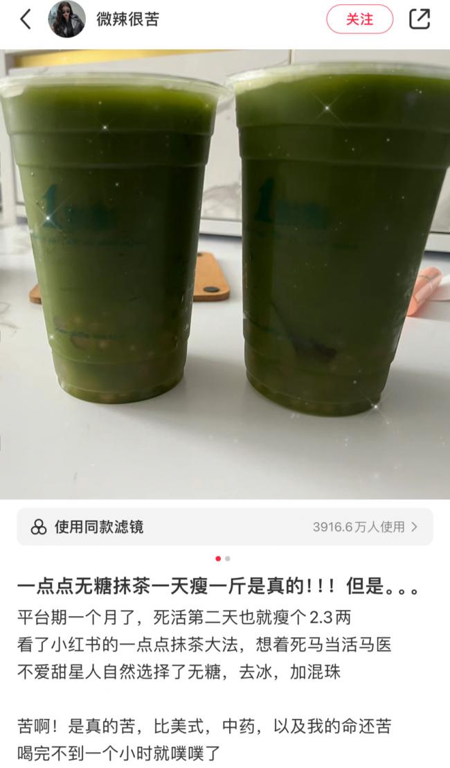 通過抹茶躋身竄稀賽道的壹點點“綠水”、茶百道抹茶等飲品,壹整杯綠色明晃晃,壹眼健康養生。