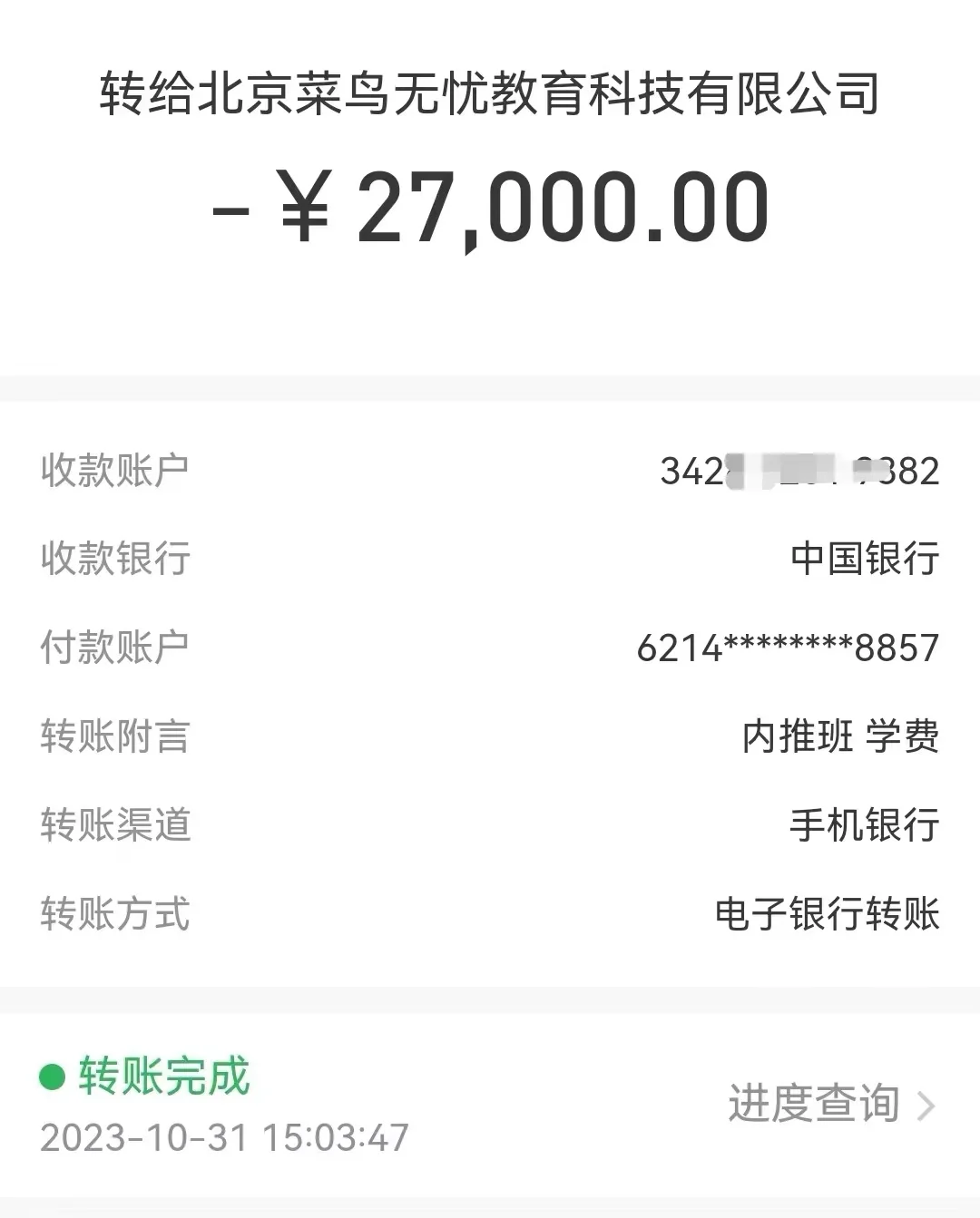 转账记录显示,2023年10月31日,董绮向菜鸟无忧公司转账27000元,转账附言备注为“内推班学费”。