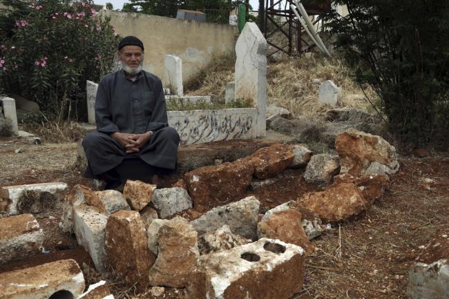2023年5月7日,馬斯托的哥哥坐在他的墳墓旁資料照。 (美聯社)