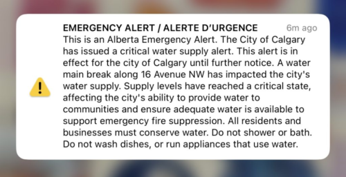 大約上午 6:45,阿爾伯塔省發布了緊急警報,對卡爾加裡市居民的限制增加了不少,卡爾加裡居民曾經被告知要“限制”用水,現在卻被告知不要淋浴、洗澡、洗碗或運行用水設備,因為供水量已達到“臨界狀態”。