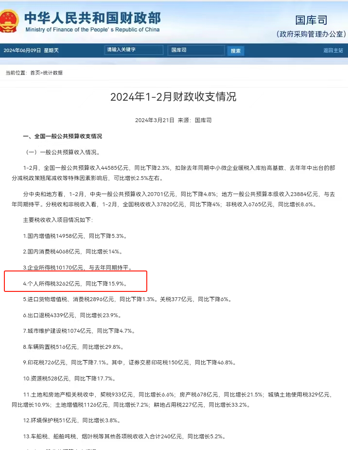 根据财政部公布的数据,今年1-2月,个人所得税收入为3262亿元,比去年同期下降了15.9%。3月份情况有所好转,今年一季度个人所得税收入为4240亿元,比去年同期下降4.5%。