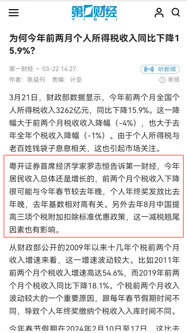 对于1-2月个人所得税收入骤降的原因,国内媒体有不同的解读。《第一财经》援引粤开证券首席经济学家罗志恒的观点认为,“2024年居民收入总体还是增长的,前两个月个税收入下降,很可能与今年春节较去年晚,个人年终奖发放比去年晚,去年基数相对高有关。另外去年8月中国提高三项个税附加扣除标准优惠政策,这一减税翘尾因素也有影响。”