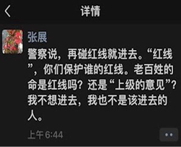 張展9日發朋友圈稱:“警察說了,再碰紅線就進去。‘紅線’,你們保護誰的紅線。老百姓的命是紅線嗎?還是‘上級的意見?’我不想進去,我也不是該進去的人。”