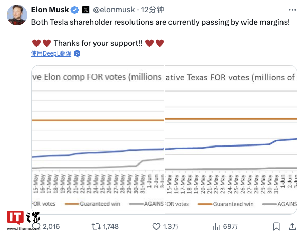 IT之家6月13日消息,今日特斯拉 CEO 馬斯克發文稱,特斯拉的兩項股東決議均以較大優勢獲得通過。馬斯克分享的圖片顯示,兩項決議(馬斯克的薪酬、特斯拉總部遷至得克薩斯州)均獲得股東投票通過。