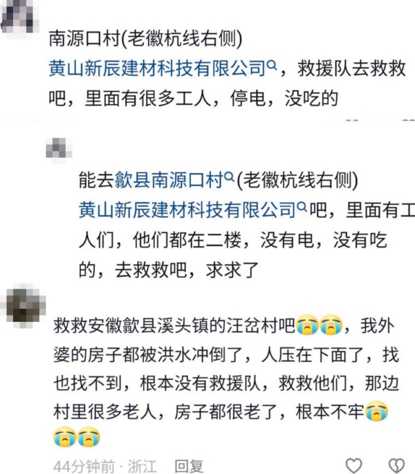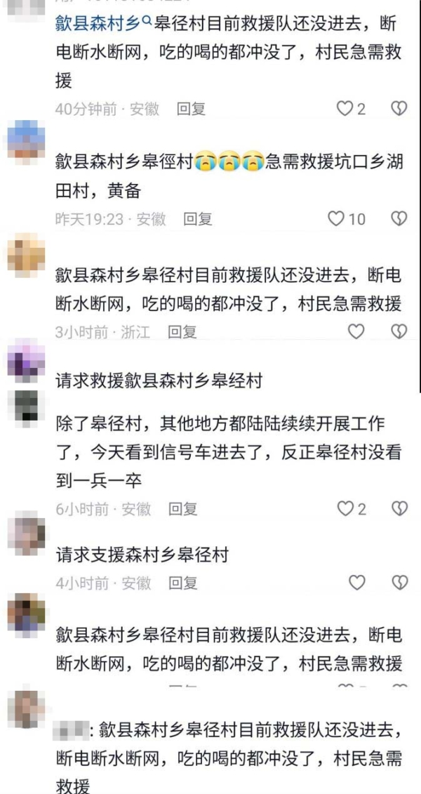 安徽黄山歙县各处村民的求救信息。(网页截图)- 新闻来源于其它媒体,内容不代表本站立场!