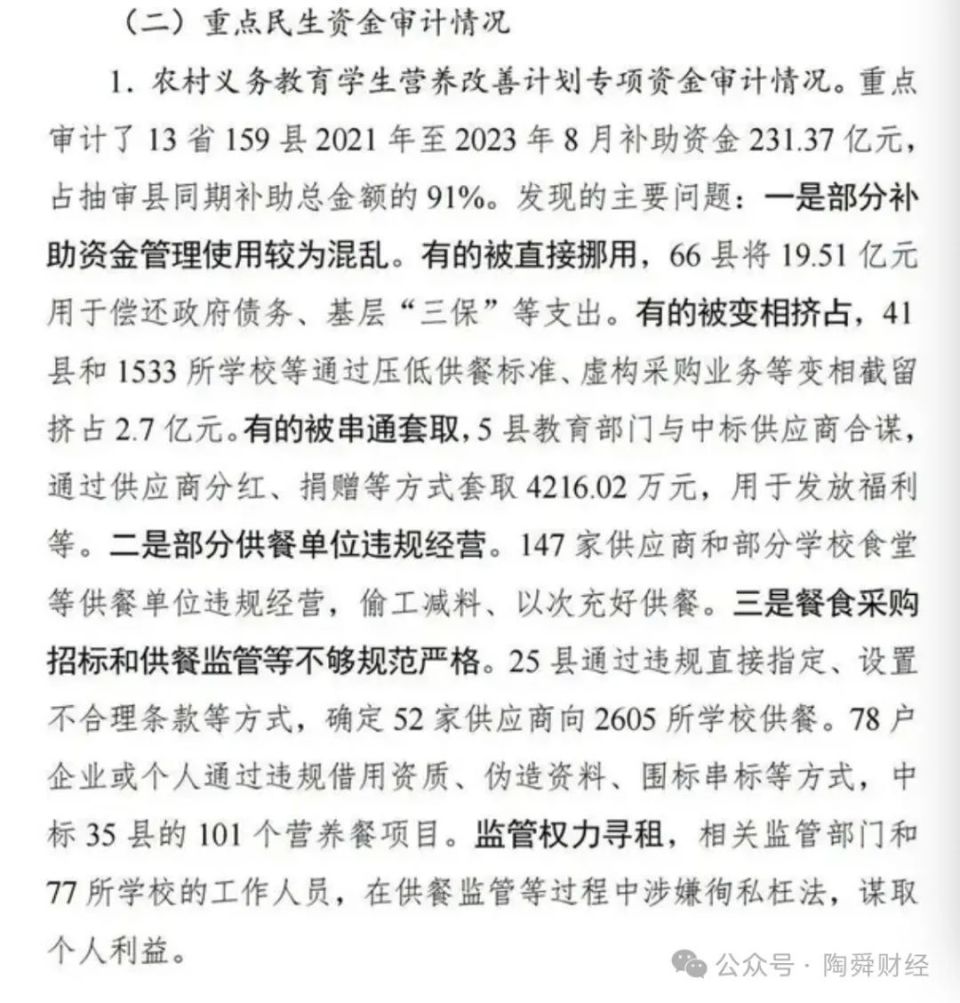 此外还有41县和1533所学校等通过压低供餐标准,虚构采购业务等变相截留挤占2.7亿元。
