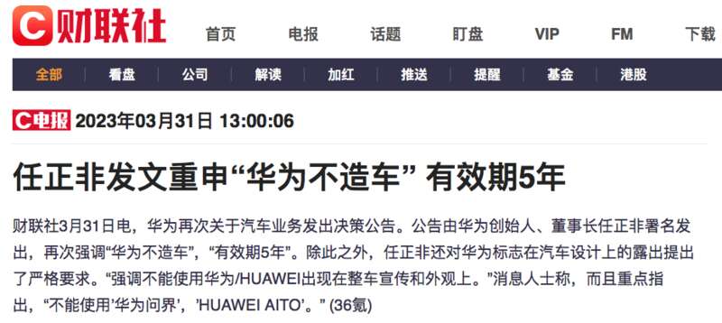 在2023年,任正非就發布了內部公告強調這件事。他還對華為標志在汽車設計上的露出提出嚴格要求,要求不能使用華為/HUAWEI進行整車宣傳,而且重點指出不能使用“華為問界”和“HUAWEI AITO”標識。