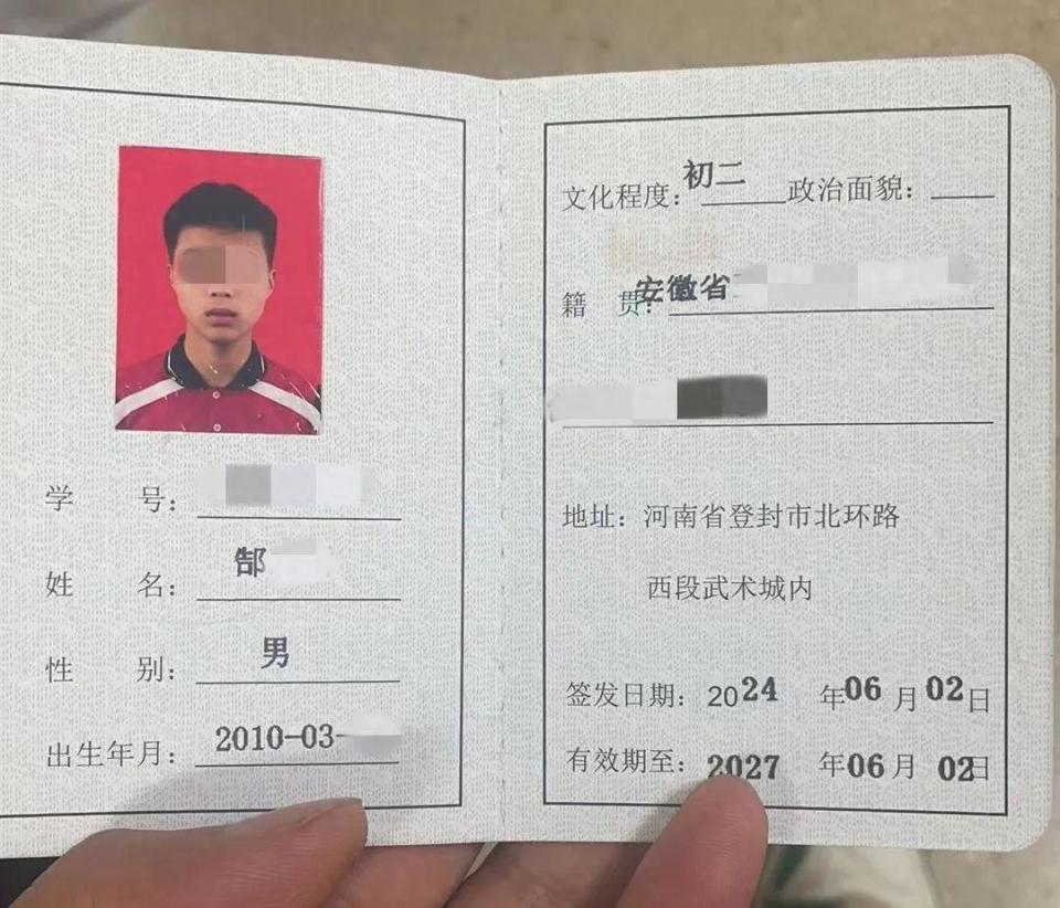 郜誠說,小哲出生於2010年3月,年僅14歲。今年2月15日,原來在安徽蚌埠某中學就讀的小哲轉學到登封市嵩山少林塔溝武術學校。