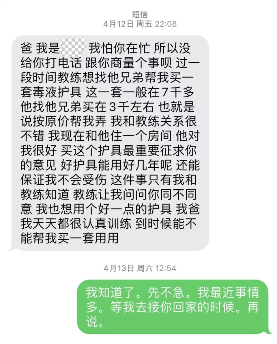 “我和教練關系很不錯,我現在和他住壹個房間,他對我很好,買這個護具最重要征求你的意見,好護具能用好幾年呢,還能保證我不會受傷,這件事只有我和教練知道。教練讓我問問你同不同意,我也想用個好壹點的護具,爸我天天都很認真訓練,到時候能不能幫我買壹套用用。”短信中稱。
