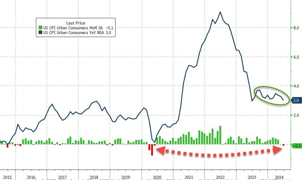 具体数据显示,美国6月未季调CPI年率录得3.0%,远低于市场预期的3.1%,大幅回落至去年6月以来最低水平。6月季调后CPI月率录得-0.1%,为2020年5月以来首次录得负值。