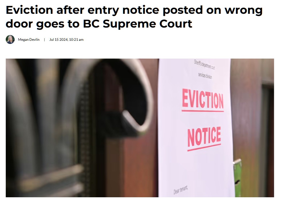 (加西網綜合)近日,BC省最高法院的壹名法官下令BC住宅租賃部門 (RTB) 重新審查壹起案件,該案件中,壹名房東試圖驅逐房客,但將通知貼在了錯誤的門上。