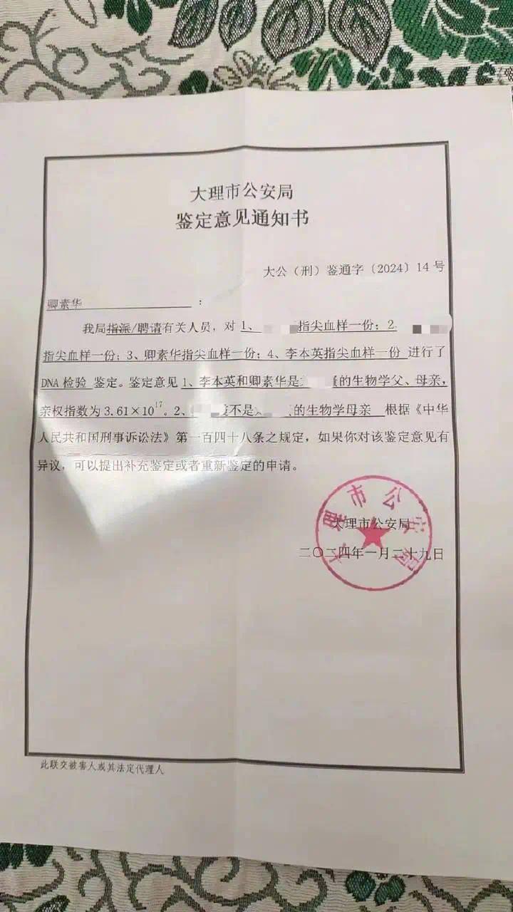 1月29日,警方出具的鉴定意见书显示,卿素华和儿子李聪DNA比对成功。 受访者供图