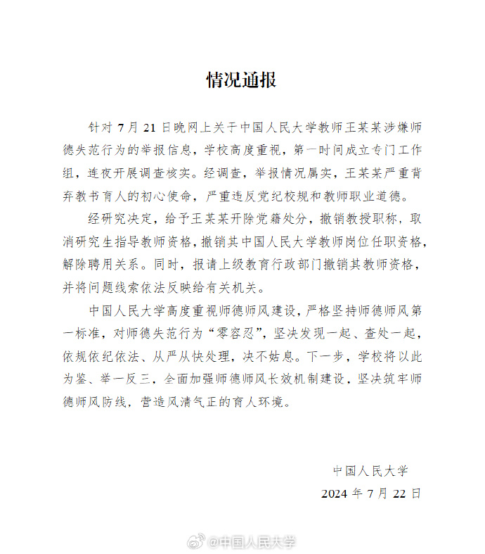 到晚上的時候,看到中國人民大學發的壹則情況通報。通報稱舉報情況屬實,給予王某某開除黨籍處分,撤銷教授職稱,取消研究生指導教師資格,解除聘用關系。